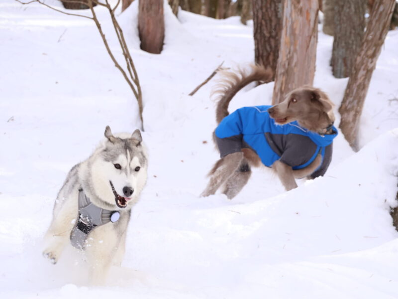 雪の中を走る犬の写真が